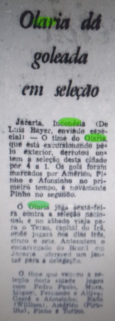 No dia 27 de maio o Olaria realizou seu terceiro jogo na Indonésia, enfrentando um selecionado de Jacarta e goleou por 4 a 1, com 2 gols de Pinho , um de Américo e outro de Afonsinho. Nesse jogo, o público foi de 20 mil pessoas.