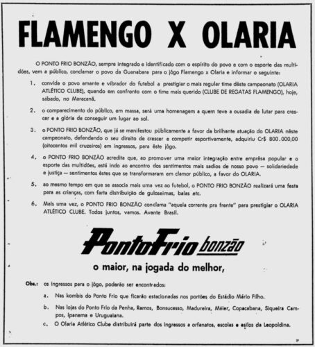“Talvez nem um pai fizesse pelo filho o que o Ponto Frio fez pelo Olaria.” (Joaquim Teixeira, vice-presidente de futebol do Olaria em 1971).