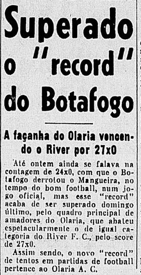 “Você sabia? Que o Olaria mantém o recorde mundial de escore no futebol, abatendo o seu adversário, o River, por 27 X 0?” (Revista do Olaria, julho de 1947, página 19).