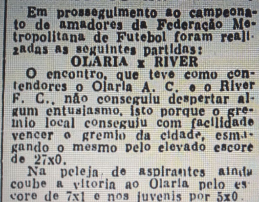 Já um outro veículo, O Jornal, ao noticiar o feito olariense, diz que o jogo nem despertou muito entusiasmo porque o grêmio local “esmagou” o River por 27 a 0.