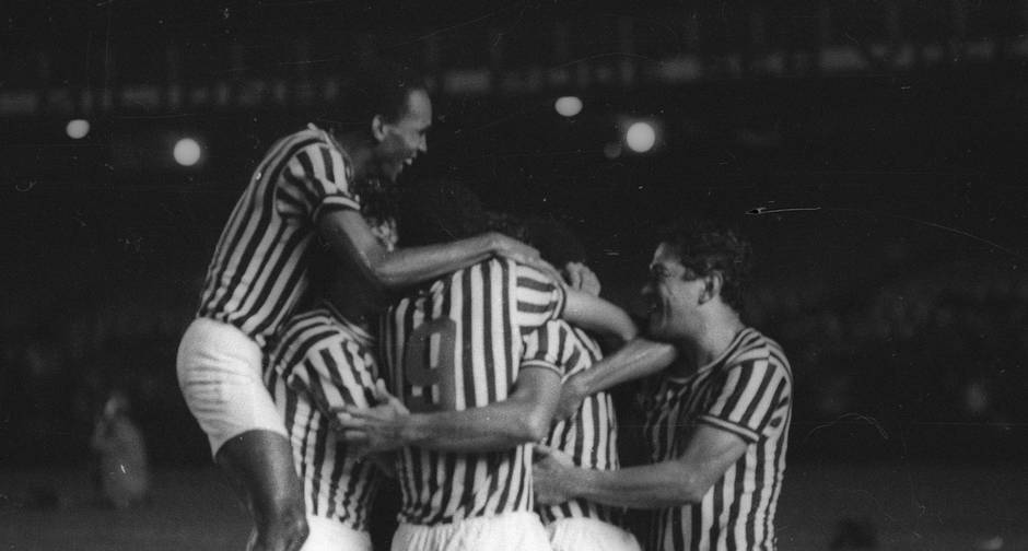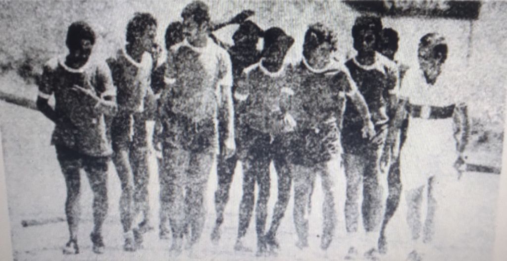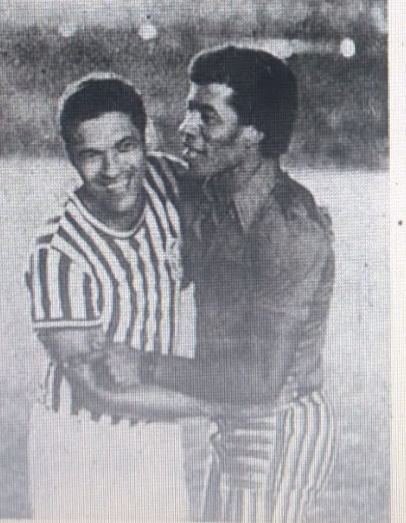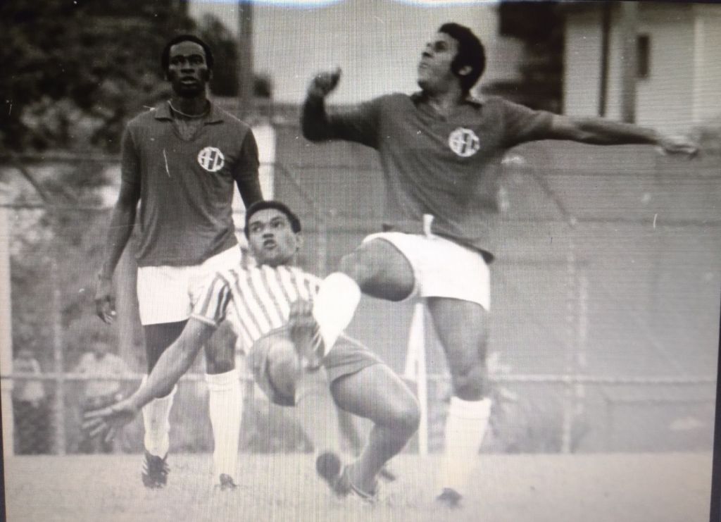 O momento em que Garrincha assinava o contrato com o Olaria. Foto: Jornal dos Sports.Garrincha, o primeiro à esquerda, em treinamento com a equipe antes da estreia contra o Flamengo. Foto: Jornal dos Sports.
