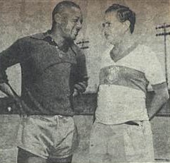 Em 1956, Barbosa, o goleiro da Copa de 1950 e um dos melhores da história, trabalhou com Jair Boaventura no Olaria. Na foto, o então veterano goleiro na Rua Bariri com o técnico do Olaria.