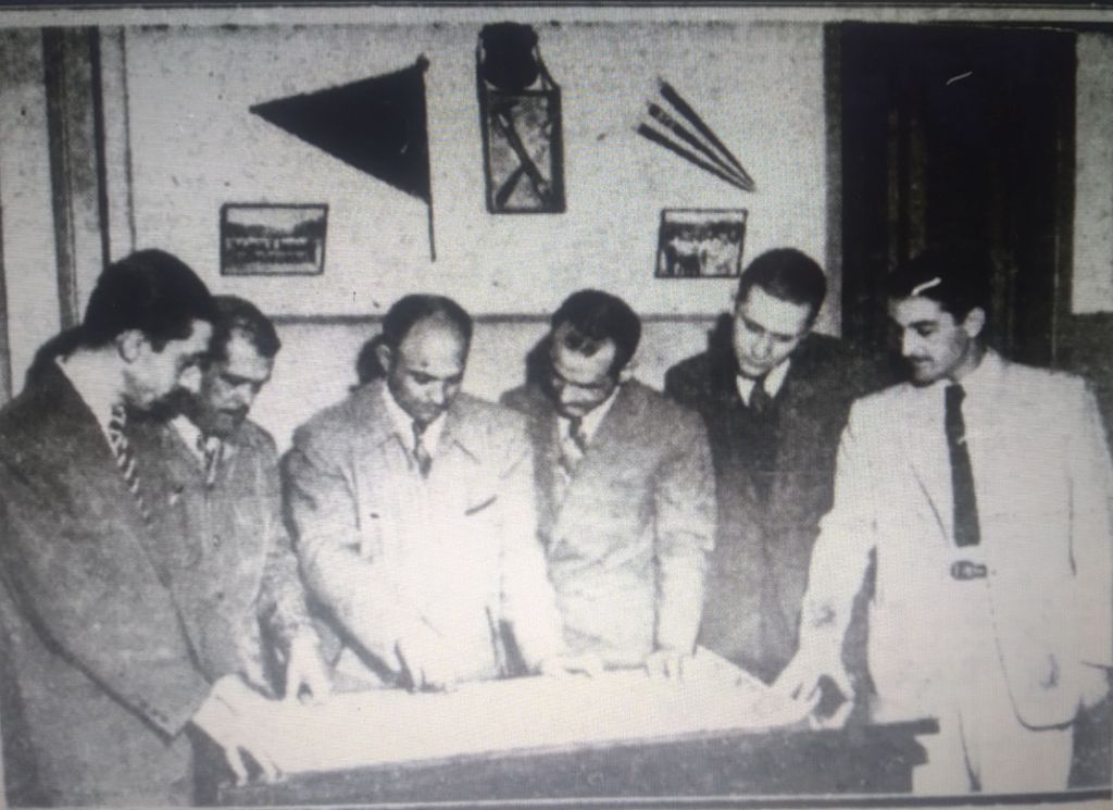 O presidente Mello e a comissão de obras apresentando o projeto do estádio da Rua Bariri ao diretor do Jornal dos Sports. O ano era 1945.