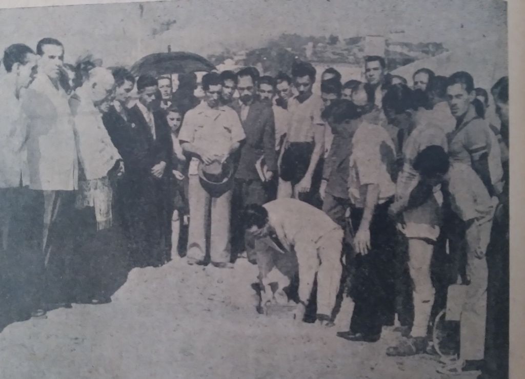 A colocação da pedra fundamental do estádio da Rua Bariri, em 23 de abril de 1944, feita pelo presidente Sylzed José de Sant’Anna Filho, vendo-se ainda o padre Luiz Mariano das Rocha, da Igreja de São Geraldo.
